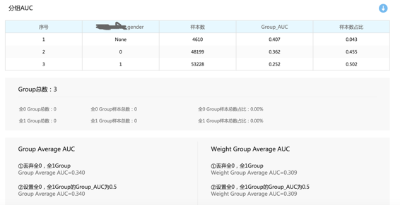 上面是一个模型评估报告中根据性别信息做分组测试的结果。分别是男,女和没有性别信息的数据的测试评分。 我们在测试的时候一般都要针对影响业务的主要字段做这种分组分析,以观察模型是否在所有数据分布下都有良好的表现。 如果某一组的评分很低,就说明模型对这种数据拟合的不好,需要建模工程师针对这种数据对模型进行更新。