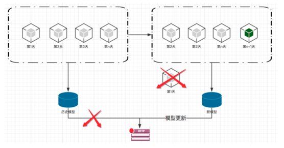 上面说过随着时间的推移数据特征发生巨大的变化,我们需要加入自学习机制。就是利用每天最新的数据来更新模型,以加强模型对新场景的拟合效果。 流程如下图: